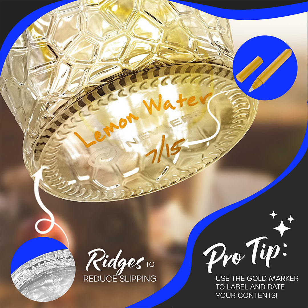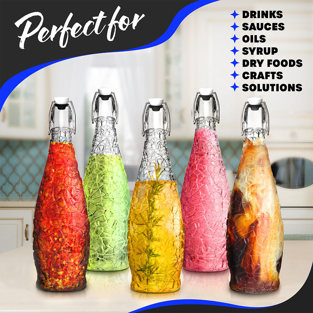 Nevlers Textured Glass Bottles are ideal for storing and serving water, juice, syrup, and other drinks in style. The rubber gasket and wire closures will help create a secure and airtight seal to preserve the bottle contents and ensure leak free storage.