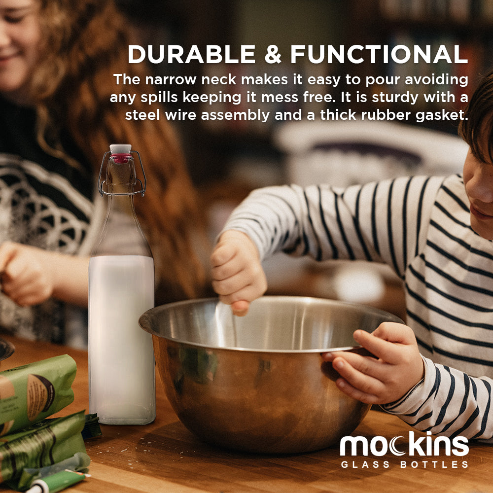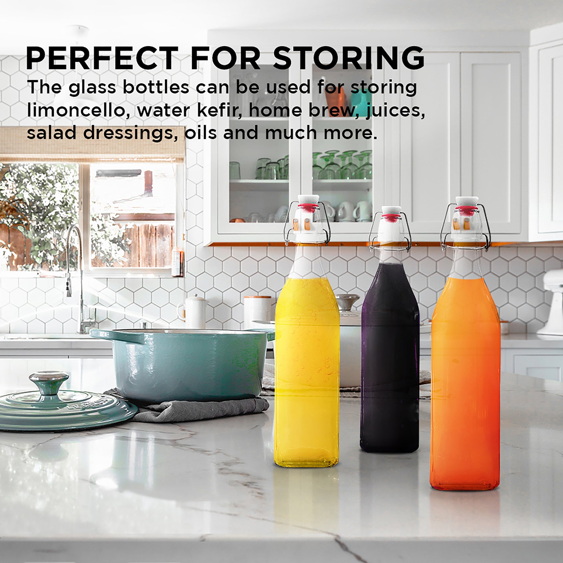 The Nevlers Square Glass Swing Top Bottles are ideal for storing and serving homebrews, juices, infused oils/water, syrups, and other liquids. These narrow-neck clear glass bottles are designed with a thick rubber gasket and steel wire clamp, to secure the seal and preserve your bottle contents.